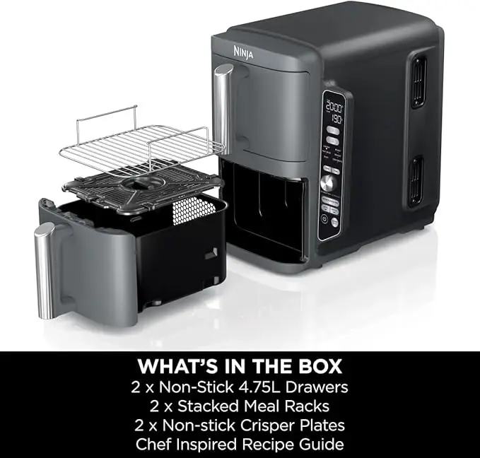 - COOK ON 4 LEVELS AT THE SAME TIME: Includes 2 x drawers AND 2x meal racks giving you 4 levels, so you can cook double the food. Rear fans ensure food is evenly cooked and crisped on all levels.